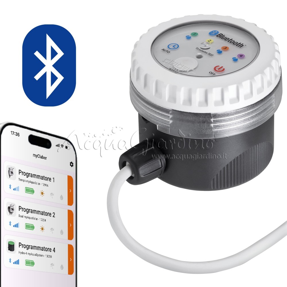 Facilissimo da usare con app myClaber (per iOS e Android) grazie alla tecnologia Bluetooth®. Comanda l’apertura e la chiusura di 4 elettrovalvole bistabili a 9 V. Tempi di irrigazione da 1 a 120 minuti. Possibilità di effettuare 2 programmi, fino a 8 cicli di irrigazione al giorno. Programmazione settimanale con esclusione dei giorni della settimana. Funzione manuale 15 minuti (modificabile fino a 120 min) oppure possibilità di attivare in modalità manuale i programmi preimpostati. Water Budget per variare da 50% a 150% l’irrigazione. Funziona con due batterie alcaline mini-stilo (AAA) da 1,5V. Tenuta stagna IP 68: il più alto grado di sommergibilità. Uno speciale supporto consente di attaccare al muro il modulo di comando per una facile programmazione e una pratica manutenzione. Collegabile con il sensore di pioggia Rain Sensor BT (90844) via Bluetooth®.